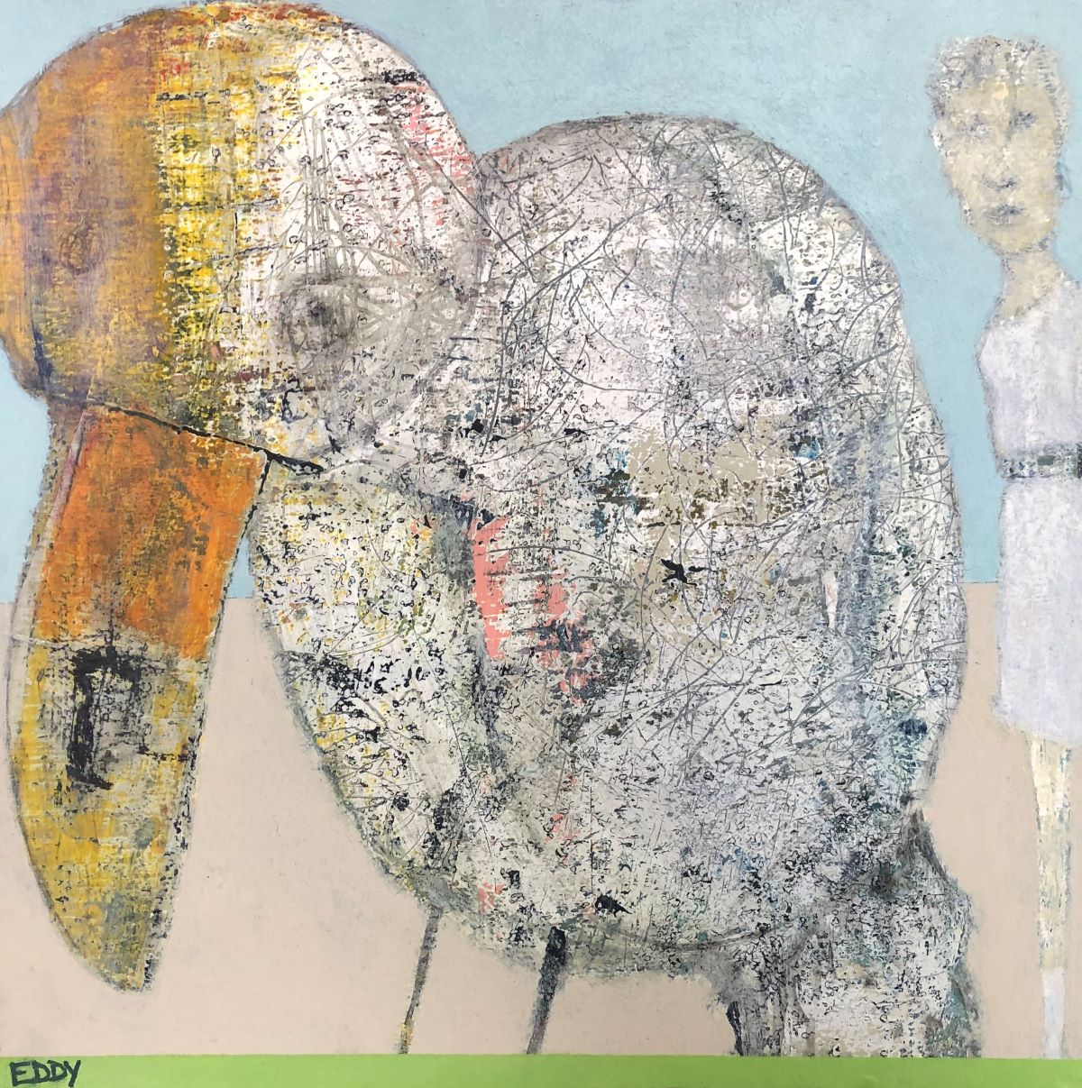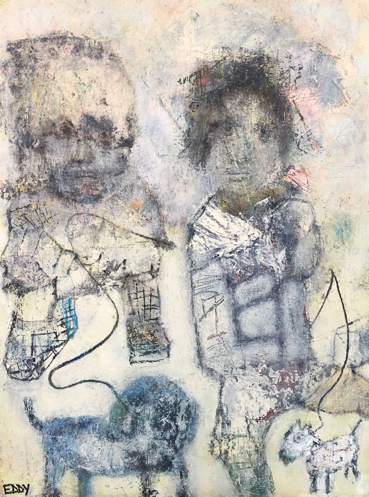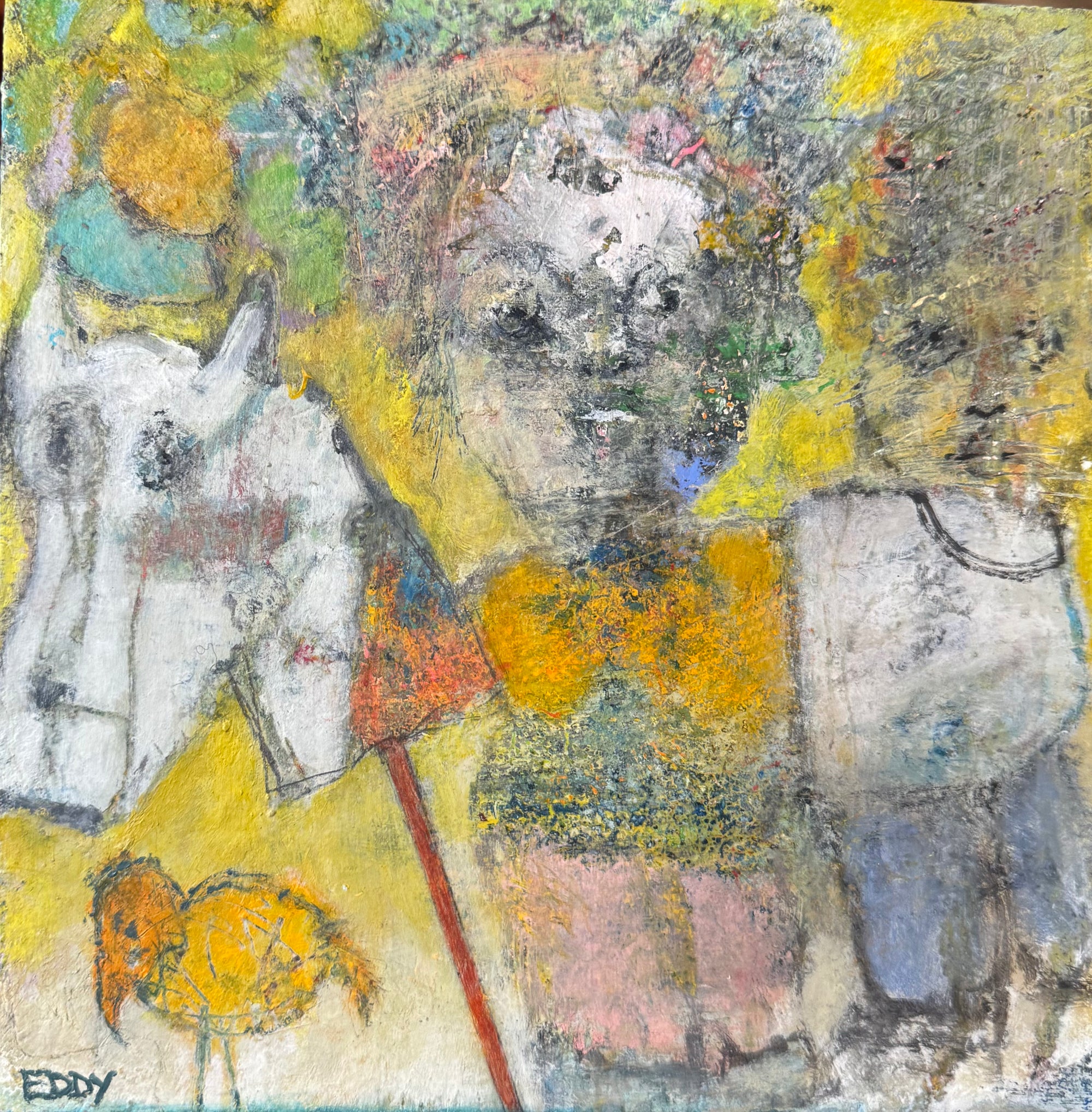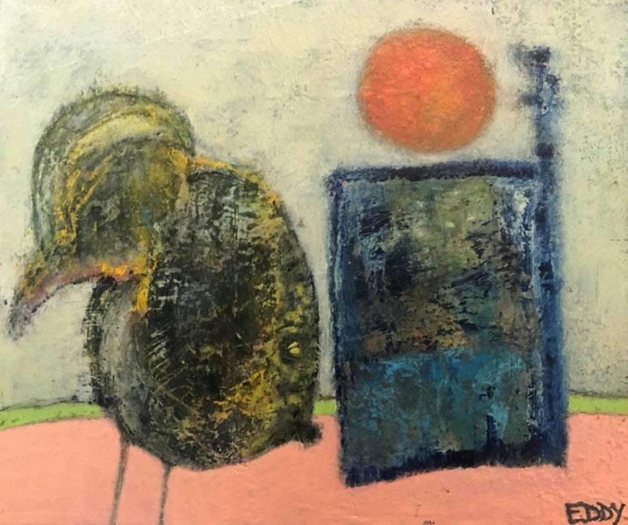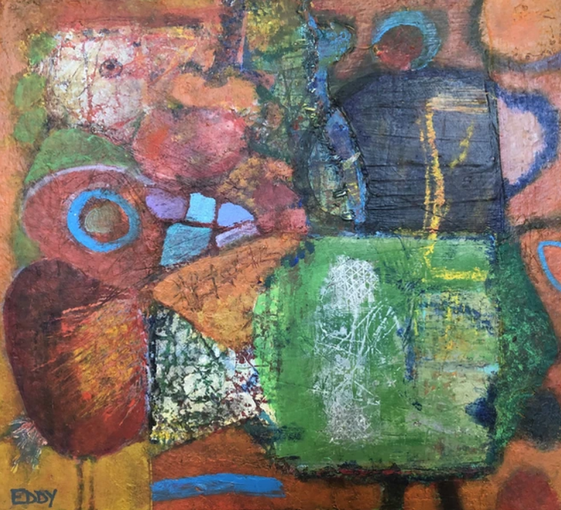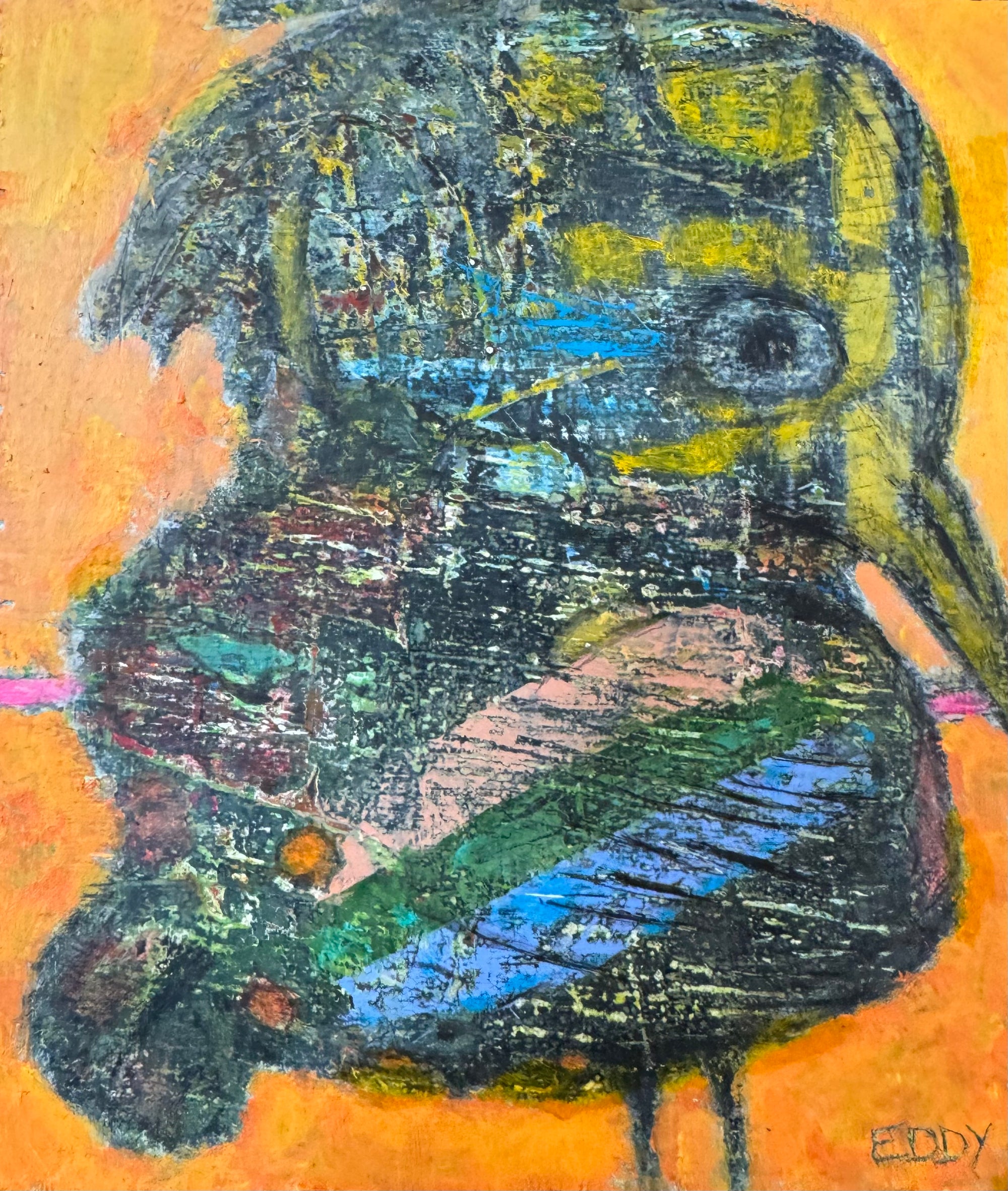 Eddy's work is wild and wonderful, haunting and imaginative, managing to make portraits that are sweet and somewhat eerie at the same time. Self taught, he pours a palpable raw energy into his painting-often chasing after images that reveal themselves during the creative process. Delightfully unique faces peer out at the viewer and areas of dazzling yet subdued color show through his scrapings and burst into life across the picture plane.