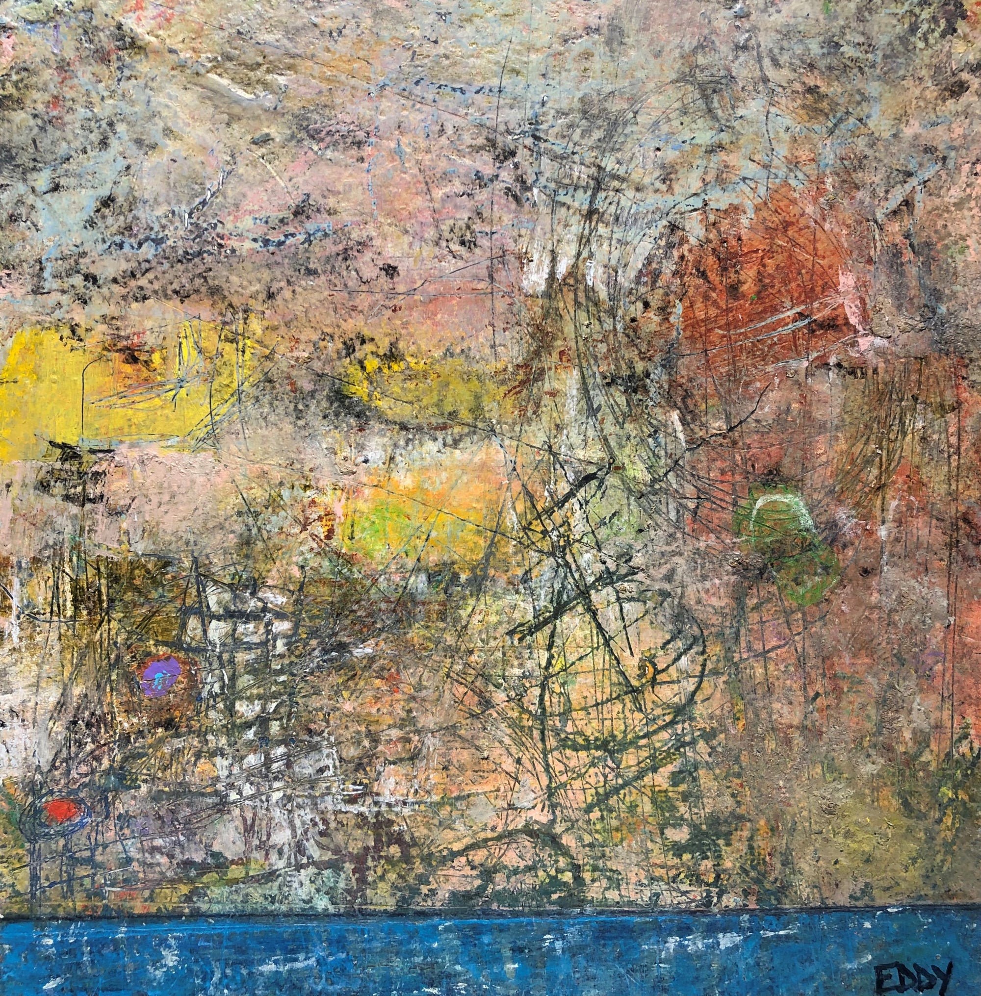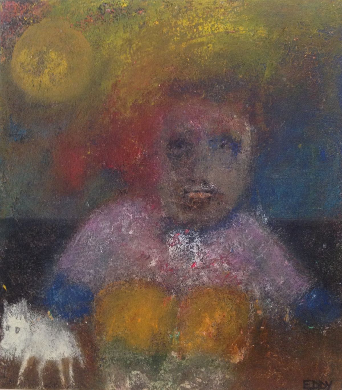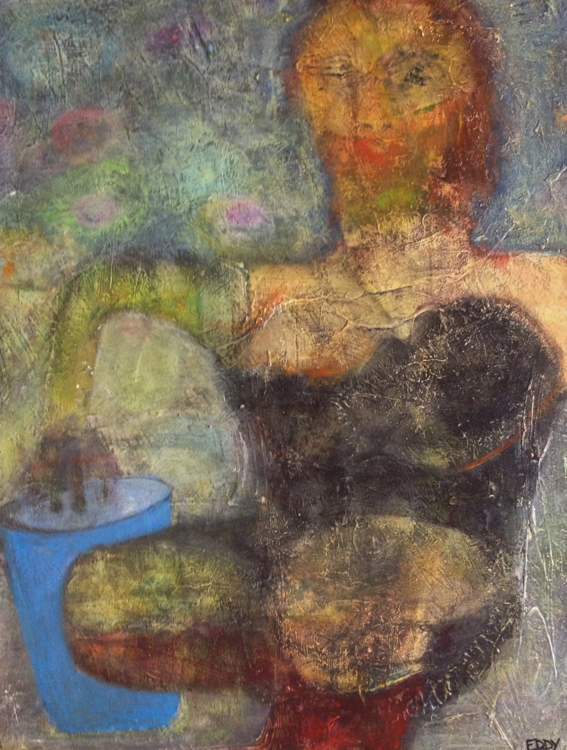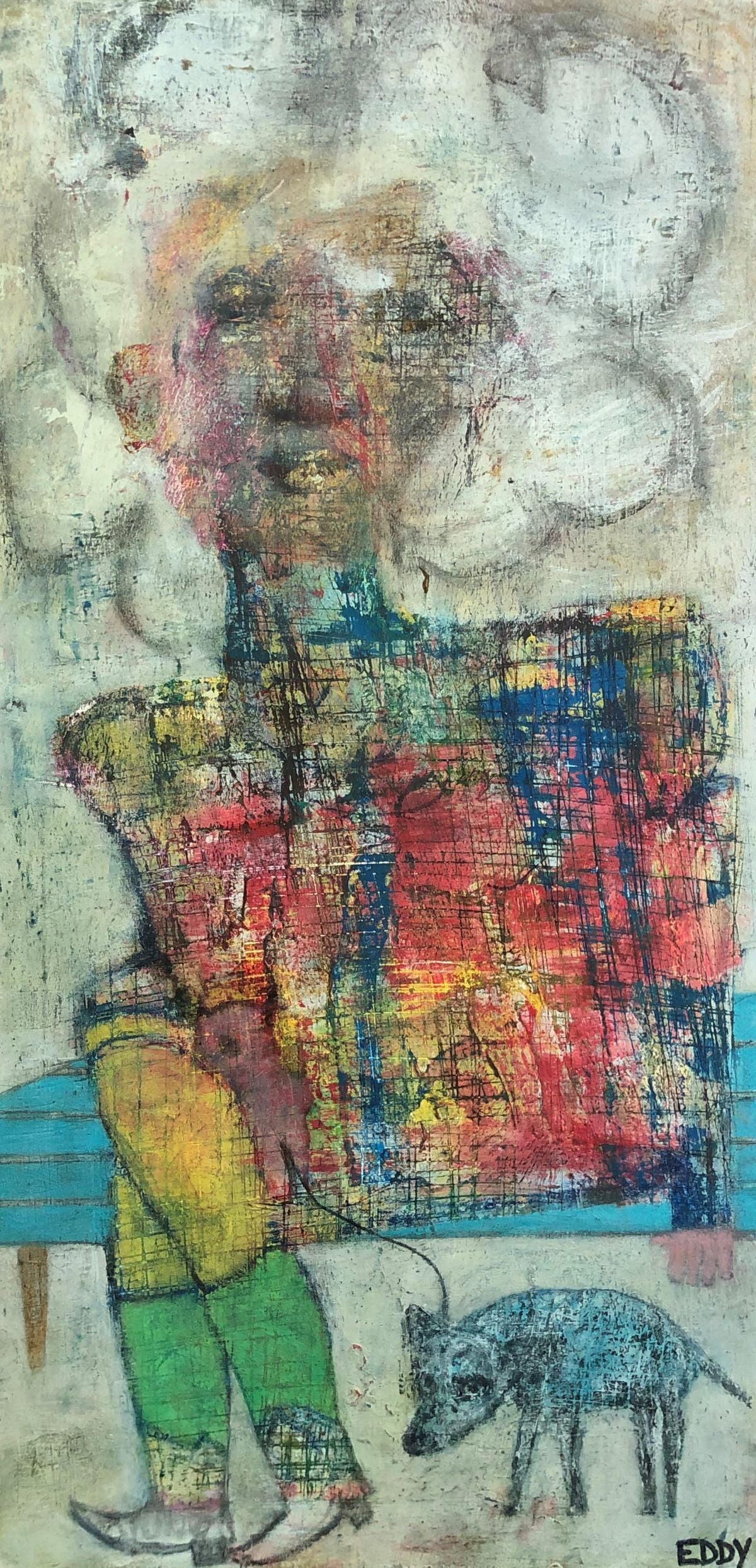 Eddy's work is wild and wonderful, haunting and imaginative, managing to make portraits that are sweet and somewhat eerie at the same time. Self taught, he pours a palpable raw energy into his painting-often chasing after images that reveal themselves during the creative process. Delightfully unique faces peer out at the viewer and areas of dazzling yet subdued color show through his scrapings and burst into life across the picture plane.