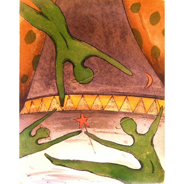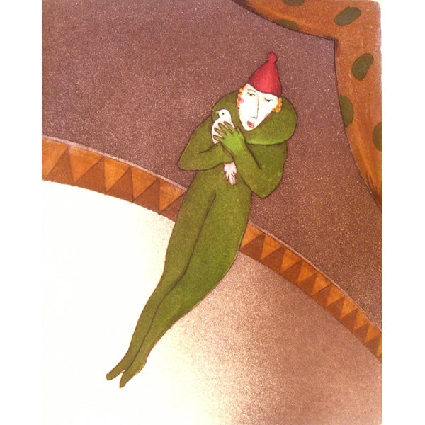 Barger’s work reflects the influence of Picasso and Matisse, evidenced by the sophistication of his works in the understatement of line and his economy of color. His imaginative, whimsical and often dreamlike etchings have a deceptive air of simplicity. Delicate as his hand-colored images are, they speak with assurance of large subjects and deep feelings; love, friendship, loneliness, childhood. That he is a professional is evident in the outstanding quality of his prints.